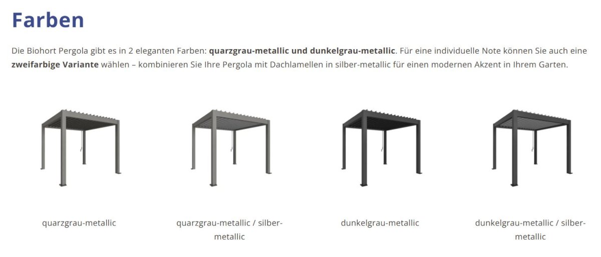 Die Biohort Pergola gibt es in 2 eleganten Farben: quarzgrau-metallic und dunkelgrau-metallic.