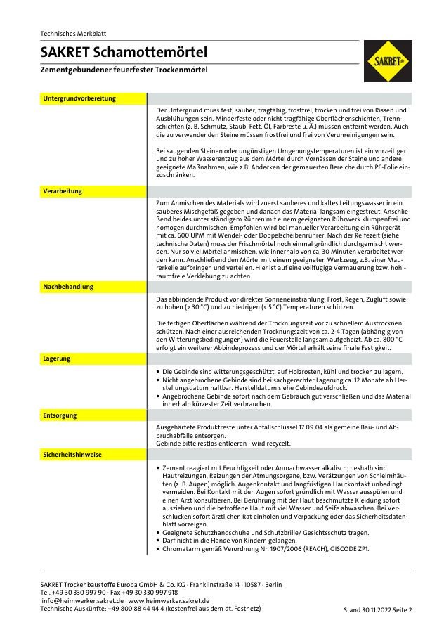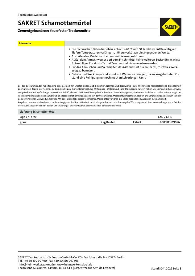 Zementgebundener feuerfester Trockenmörtel Artikel-Nr.: 14215100 Hersteller: SAKRET Trockenbaustoffe Europa GmbH & Co. KG Grundpreis: € 4,26/kg