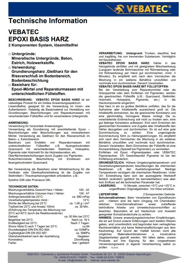 Epoxy Basis Harz - 2 Komponenten System, lösemittelfrei Artikel-Nr.: 88000031 Hersteller: VEBATEC Chemische u. technische Produkte GmbH Grundpreis: € 5,28/ 100 g