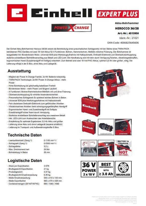 Akku-Bohrhammer - kraftvoll und langlebig - mit Einhell PurePOWER Brushless Motor - Art.Nr.: 4513950 Artikel-Nr.: 85000420 Hersteller: Einhell Germany AG