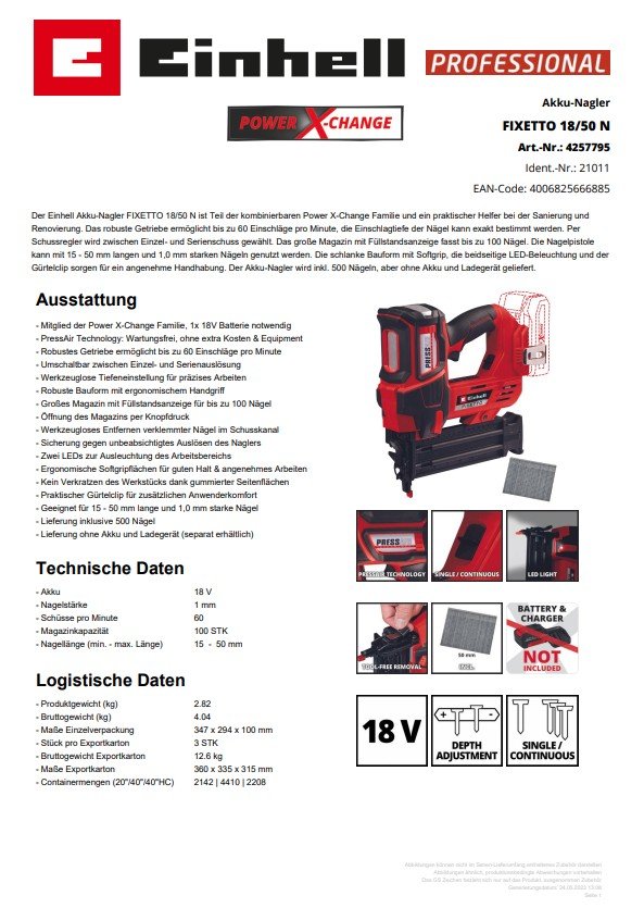 Akku-Nagler - PressAir-Technology - Für den professionellen Einsatz - Art.Nr.: 4257795 Artikel-Nr.: 85000427 Hersteller: Einhell Germany AG