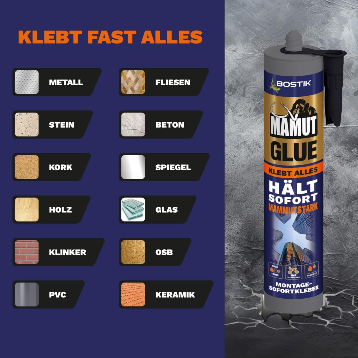 MAMUT GLUE eignet sich als Montage-Sofortkleber zum Verkleben nahezu aller Baumaterialien wie Stein, Beton, Glas, Gipskarton, PU, PVC, Hartkunststoffen, glasierten Flächen, Keramik, Kupfer, Blei, Zink, Zinn, Aluminium, Metallen, Legierungen, Edelstahl, HPL- und Zementfaserplatten sowie verfärbungsunempfindlichen Natursteinen. Für die Montage von UW-Metall-Rahmenprofilen im Trockenbau sowie auch für die Verklebung von Akustikpaneelen perfekt geeignet. MAMUT GLUE ist außerdem zur Verklebung von Spiegeln geeignet.