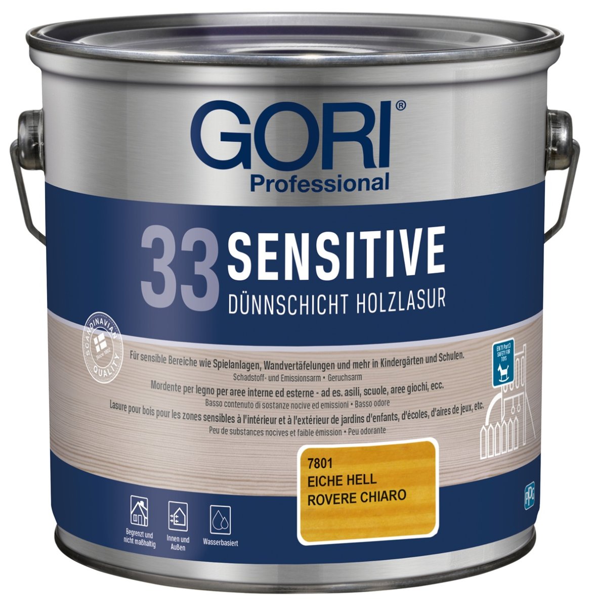 GORI 33 ist eine wasserbasierte, schadstoff- und emissionsarme Lasur für alle begrenzt und nicht maßhaltigen Holzoberflächen in sensiblen Anwendungsbereichen im Innen- und Außenbereich. Die tropfgehemmte Lasur ist geruchsarm, schnelltrocknend und leicht zu verarbeiten. Zertifiziert nach DIN EN 71 Teil 3, Sicherheit für Kinderspielzeug.