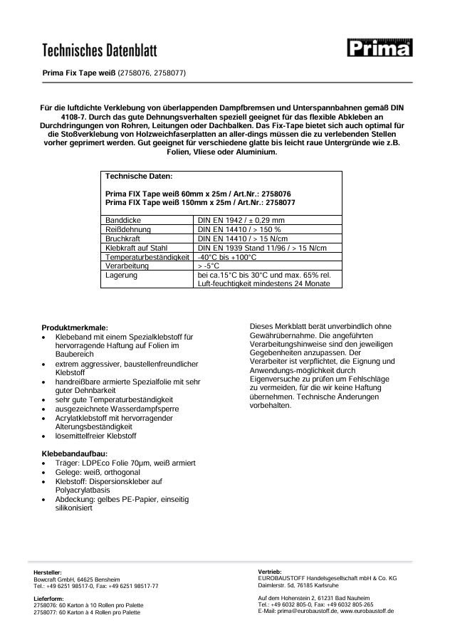 Das Prima FIX Tape ist optimal geeignet für die wind- und regensichere Verklebung von Überlappungen und Durchdringungen an Unterdeck-, Schalungsund Fassadenbahnen. Mit 20 % mehr Kleber ist das Prima FIX Tape ideal für stark geprägte Unterdeckbahnen geeignet. Der Fingerlift gewährleistet ein schnelles und sauberes Arbeiten.
