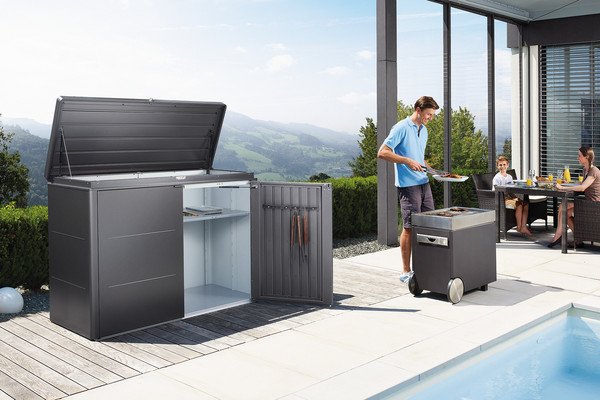 Die Einsatzmöglichkeiten des HighBoard sind dank Flügeltüren und Deckelöffnung vielfältig: ob als Stauraum für Kissen oder Gartenutensilien oder auch als ideale Ergänzung zu Ihrer Outdoor-Küche - alles ist witterungsgeschützt und ordentlich verstaut. Die edle Optik wurde von Industrie-Designern entworfen und ist garantiert ein Highlight auf Ihrer Terrasse.