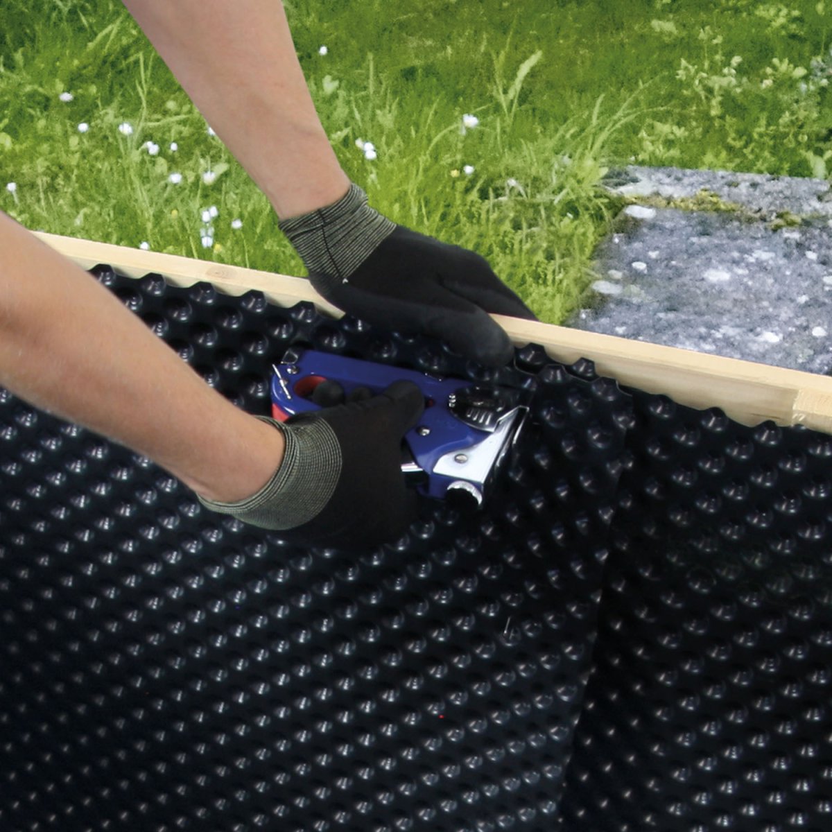 Durch die Anwendung der Noppenfolie in Schadstoffgeprüfter, professioneller, schwerer Gärtnerqualität hältst Du Schmutz und Feuchtigkeit fern und unterbindest z.B. den Zersetzungsprozess von Holz das ohne Schutz anfängt nach spätestens ein bis zwei Jahren zu Verrotten.
