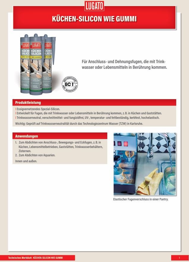 - Entwickelt für Fugen, die mit Trinkwasser oder Lebensmitteln in Berührung kommen, z. B. in Küchen und Gaststätten.