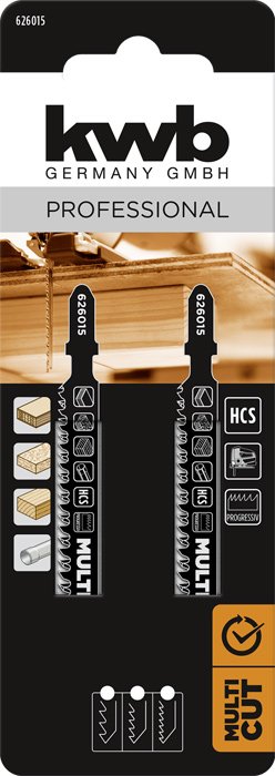 Das kwb Multicut HCS-Stichsägeblätter-Set für Holz mit progressiver Zahnteilung ist ideal für präzise Schnitte in Tischlerplatte, Spanplatte, Weichholz und Kunststoff.