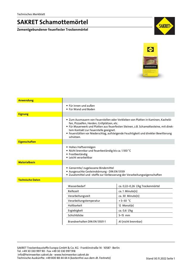 Zementgebundener feuerfester Trockenmörtel Artikel-Nr.: 14215100 Hersteller: SAKRET Trockenbaustoffe Europa GmbH & Co. KG Grundpreis: € 4,26/kg