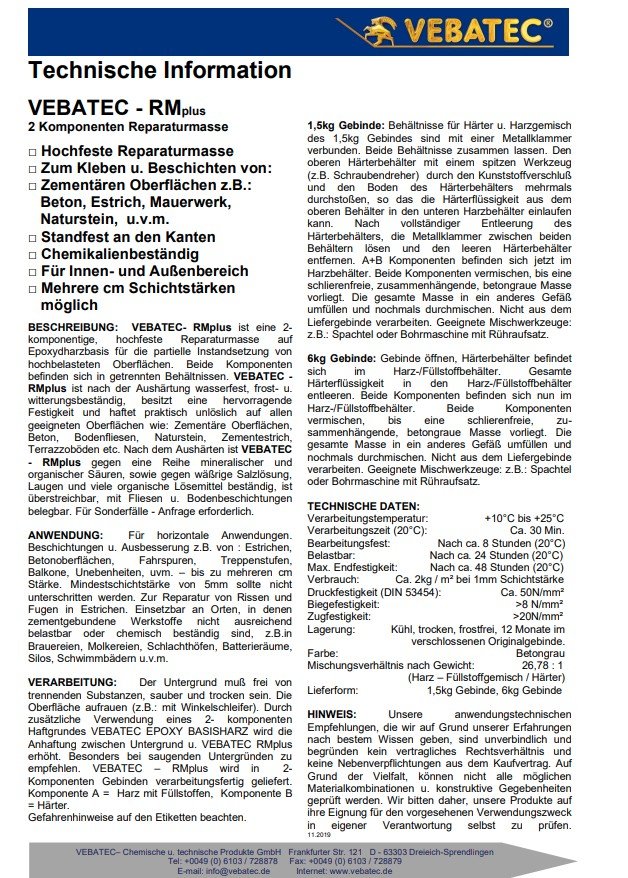Beide Komponenten befinden sich in getrennten Behältnissen. Vebatec RMplus ist nach der Aushärtung wasserfest, frost- u. witterungsbeständig, besitzt eine hervorragende Festigkeit und haftet praktisch unlöslich auf allen geeigneten Oberflächen wie: Zementäre Oberflächen, Beton, Bodenfliesen, Naturstein, Zementestrich, Terrazzoböden etc.