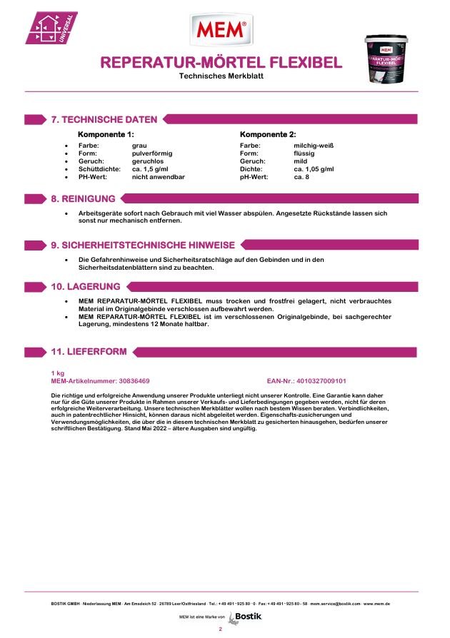 Shop » Detailansicht MEM REPARATUR-MÖRTEL FLEXIBEL - Dichtspachtel