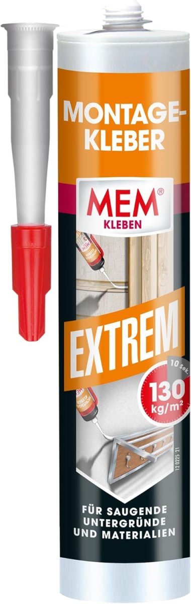 MEM MONTAGE-KLEBER EXTREM ist ein pastöser, lösemittelfreier Klebstoff, der sich durch seine extreme Anfangshaftung von bis zu 130 kg/m² nach nur 10 Sekunden und durch extreme Endfestigkeit auszeichnet.