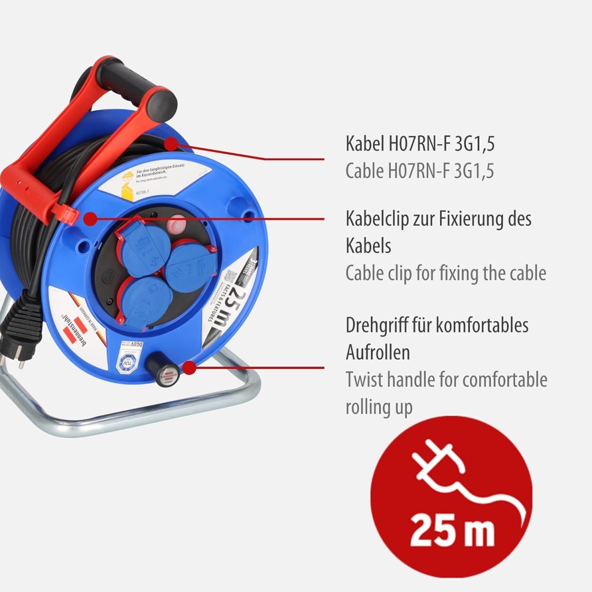 - Kabeltrommel 25m mit 3 Schutzkontakt-Steckdosen, spritzwassergeschützt, mit selbstschließenden Deckeln