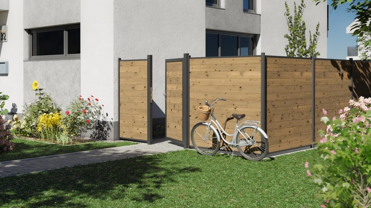 Das Zaunfeld-Set aus Thermokiefer besteht aus 13 massiven Profilen und Abschlussleisten oben und unten in Anthrazit.