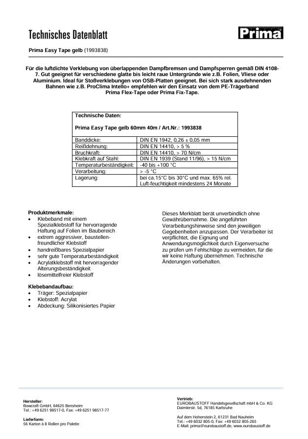 Das Prima Easy Tape eignet sich besonders für die luftdichte Verklebung von Überlappungen an Dampfbrems- und Dampfsperrfolien sowie Stoßverklebungen von OSB Platten.
